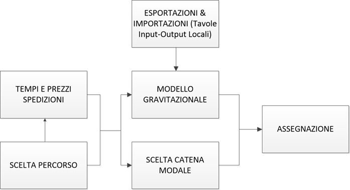 In letteratura, due sono stati gli approcci utilizzati per rappresentare i legami diretto e inverso tra economia e mobilità delle merci: quello basato su modelli Multi-Regional Input-Output (MRIO) a coefficienti elastici, e quello basato su modelli Spatial – Computable General Equilibrium (S-CGE). La presente ricerca sviluppa l’approccio basato sul modello gravitazionale (gravity model).