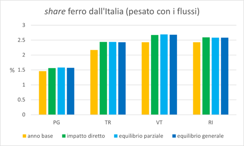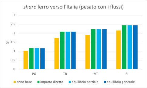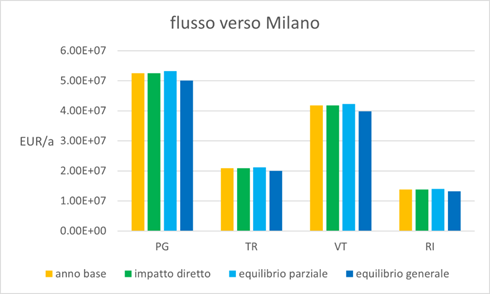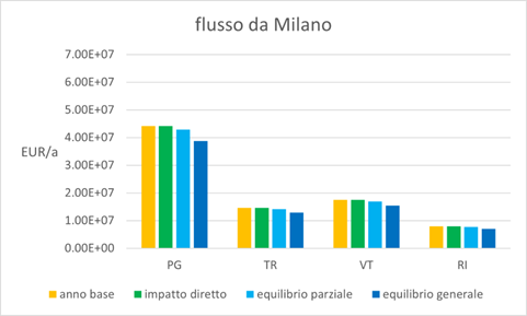 Alcuni impatti per le quattro province di Perugia, Terni, Viterbo e Rieti sono riportati nelle figure di seguito: i flussi per e dalla città metropolitana di Milano e gli share per e dalle altre zone dell’Italia della catena modale strada-ferrovia. Tali share, come era atteso, aumentano quando si passa dallo scenario dell’anno base al controfattuale di equilibrio generale.