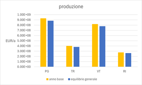 Le produzioni delle quattro province diminuiscono quando si passa dallo scenario dell’anno base al controfattuale di equilibrio generale. La diminuzione può essere spiegata dalla concorrenza tra le quattro province che origina dai costi di trasporto ridotti. Ad es. i prodotti di Perugia devono competere con quelli di Terni che diventano più convenienti. Si ha una pressione verso il basso sui prezzi al cancello della fabbrica. Ciò in quanto, con l’assunzione di costi di tipo iceberg, il modello gravitazionale considera, in un quadro di statica comparata, i livelli produttivi come fissi.