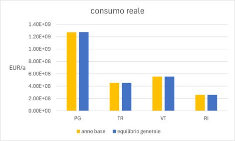 Ai fini della valutazione degli impatti del progetto o politica sul welfare si considera il consumo reale della zona NUTS3. Questo è pari al rapporto tra spesa nello scenario di equilibrio generale ed MRI di importazione.